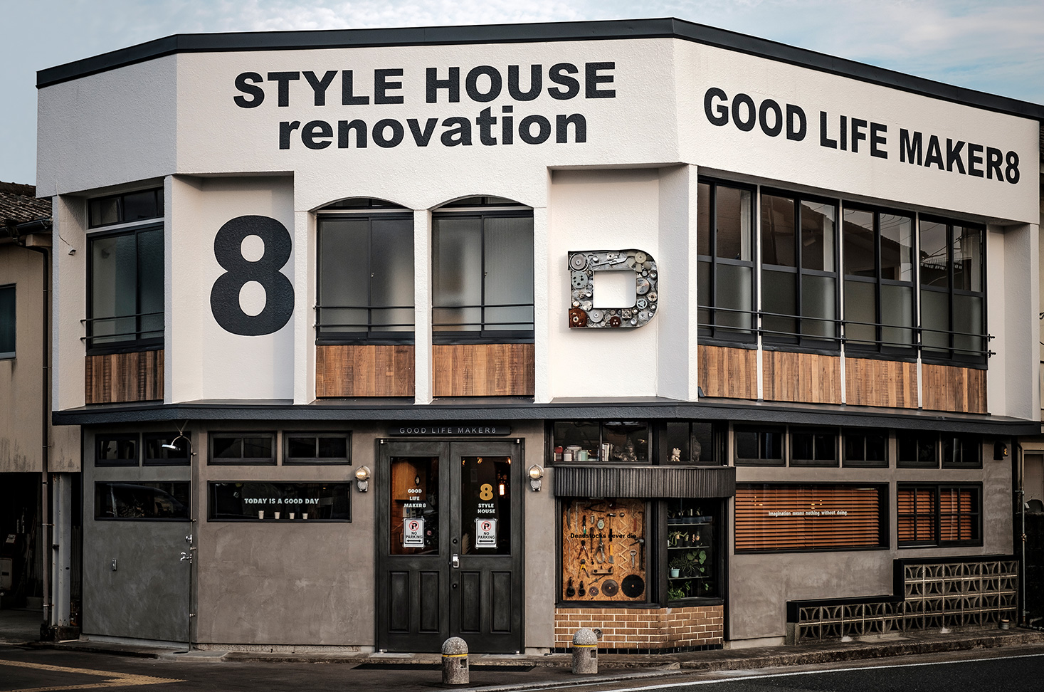 GOOD LIFE MAKER8は、鹿児島県出水市出水駅の目の前にあります。1Fには、人気の料理人が日替わりで登場するカフェと、パーツショップ。2Fには、STYLE HOUSE(新屋建築)のショールームがあります。